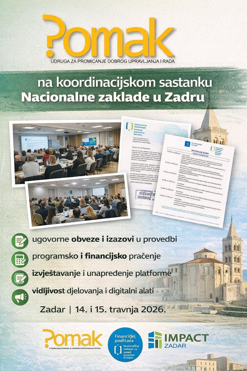 Predstavnici udruge Pomak sudjelovali su 14. i 15. travnja 2026. godine na koordinacijskom sastanku i izobrazbi za korisnike institucionalne podrške Nacionalne zaklade za razvoj civilnoga društva u Zadru.